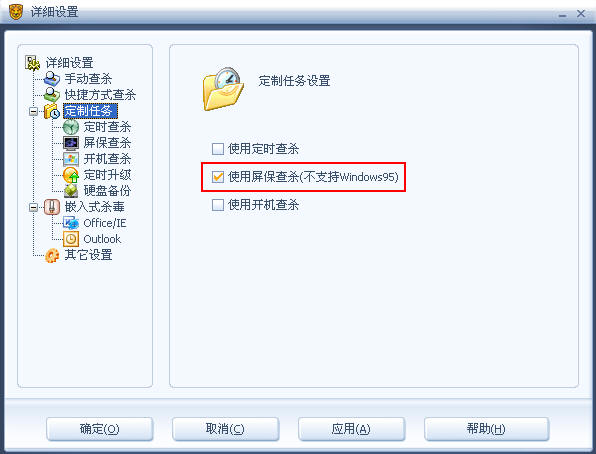 打开杀毒软件/设置/详细设置/定制任务,把图中框选的勾去掉。
