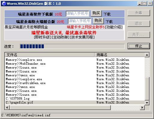 我尝试性下载了 ravDiskGen.exe 1.0 查出来了病毒 , 是Worm.Win32.DiskGen 但杀到如图这里就自动退出了.