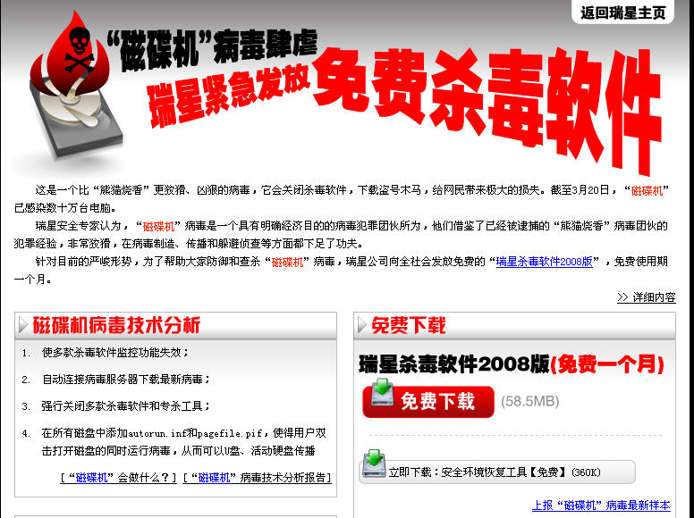 最近“磁碟机”病毒比较严重,为了帮助大家防御和查杀“”病毒,瑞星公司向全社会发放免费的“瑞星杀毒软件2008版”,免费使用期一个月。