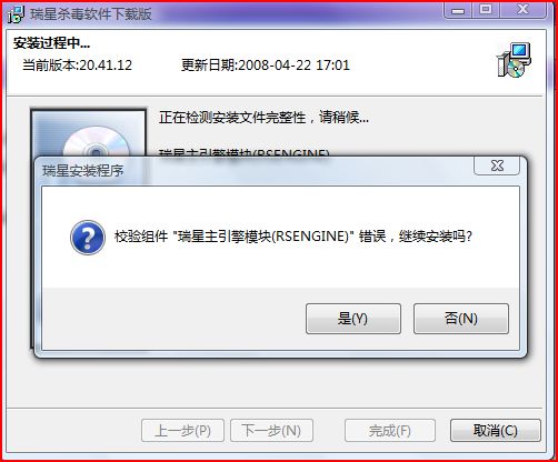昨天我升级到20.41.12时提示了瑞星主引擎模块校验错误,是否继续安装?我选的继续,然后升级,但是完毕后就变黄伞了?!