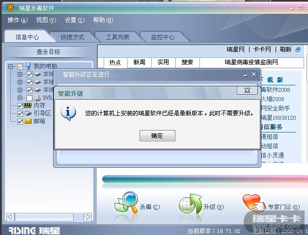 但是瑞星杀毒软件只能升到2007版~版本为19.71.02 再升就显示是最新版~