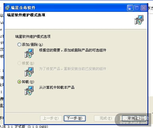 修复杀毒软件:点开始/程序/瑞星杀毒软件/添加删除组件,选第二项修复,直到完成。