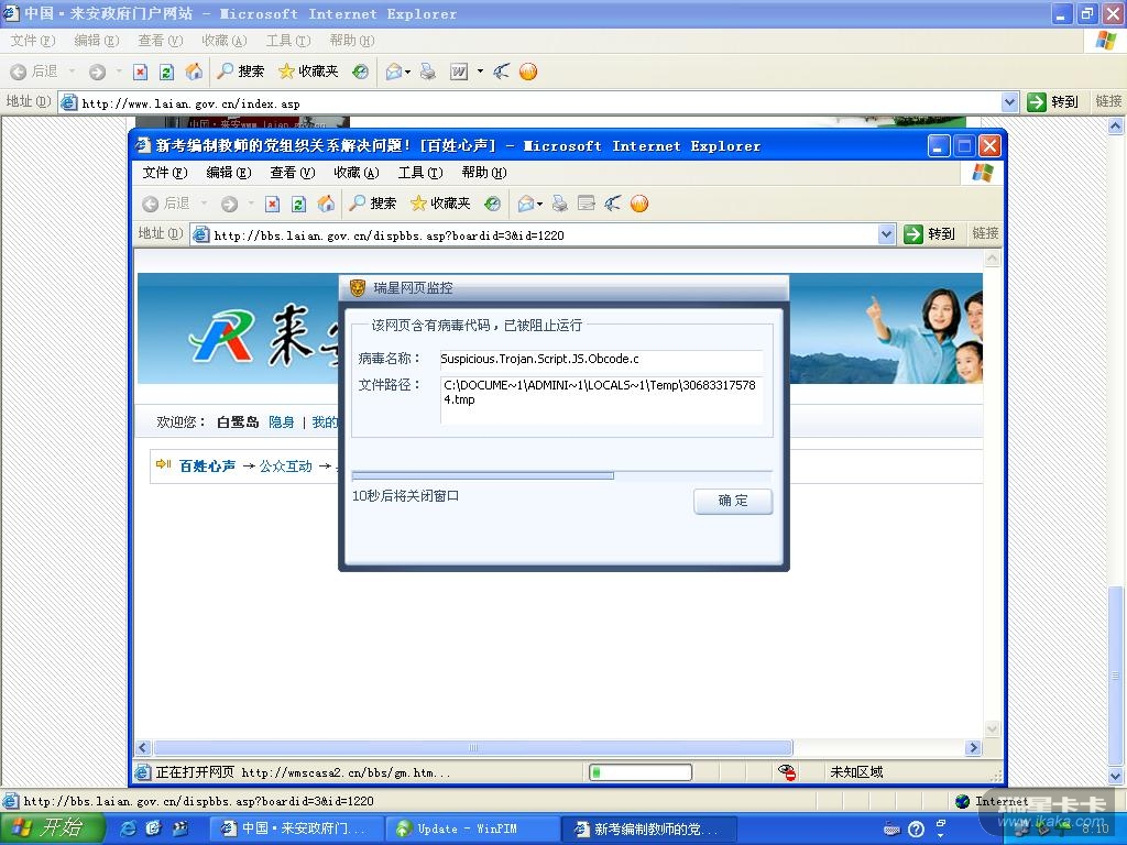 症状现象:每日第一次打开论坛,就出现网页病毒提示,关闭后再次打开网页就没有提示了