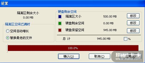 磁盘剩余空间总计945mb,硬盘保留空间945mb,没有留下空间给病毒隔离区!