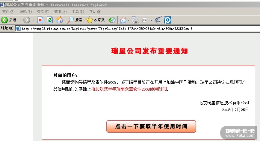 恭喜您!鉴于瑞星目前正在开展“加油中国”活动,瑞星公司决定在您的瑞星杀毒软件2008免费6个月的基础上,将免费使用期延长至一年。