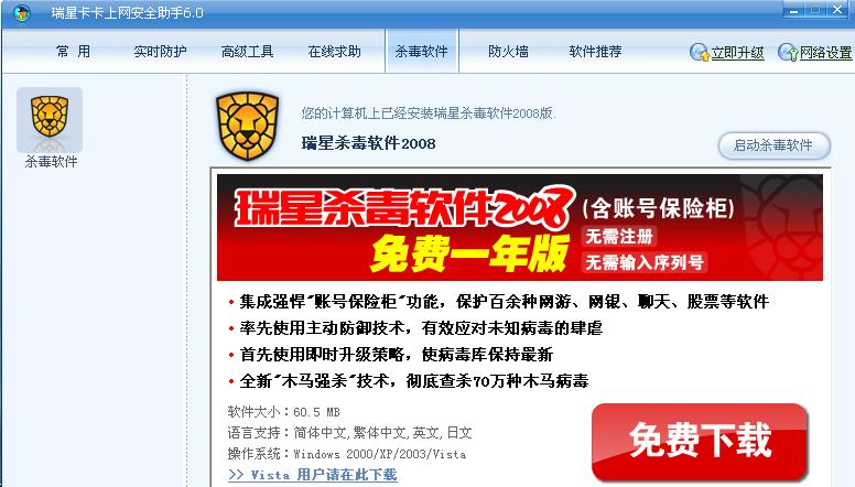 回复:请问瑞星到底有没有免费2008版杀毒软件。