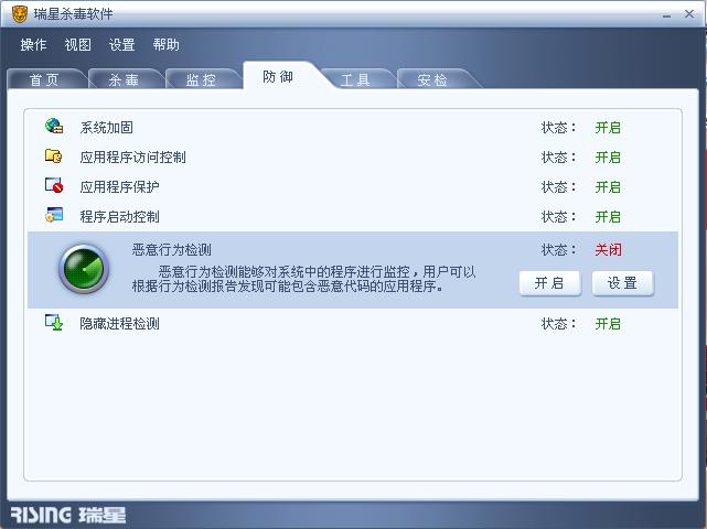 在防御栏恶意行为检测状态是关闭状态,我设置开启,没有任何反映,也就是开启不了!