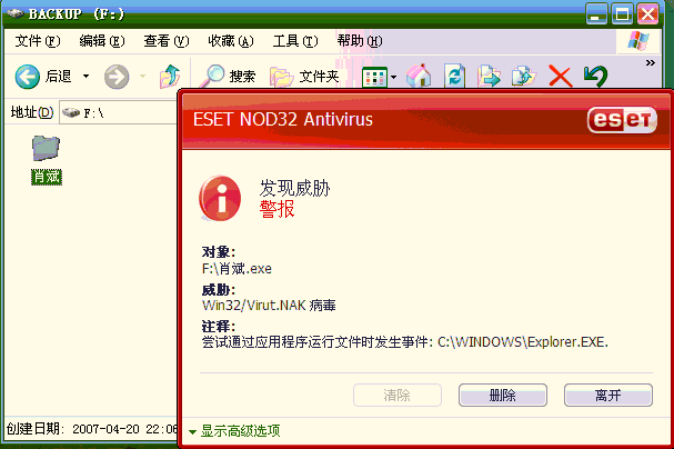 超级郁闷和超级急的问题! 请斑竹和高手2008-08-12 13:23:29 文件系统实时防护 文件 F:\肖斌.exe Win32 irut.NAK 病毒 已删除 - 已隔离 NT AUTHORITY\SYSTEM 尝试通过应用程序访问文件时发生事件: C:\WINDOWS\Explorer.EXE.