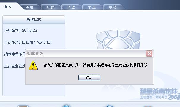 瑞星的监测也没了,打开杀毒软件,重新升级的时候又出现了这个: