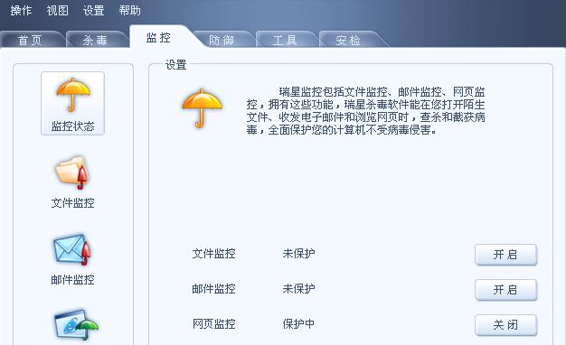 瑞星的实时监控中的文件监控与邮件监控无法开启,不知是何原因,用瑞星全面杀毒却没检出有病毒。我的瑞星是正版的,不过最初是06版的,一直升级到现在,目前已升级至最新版本