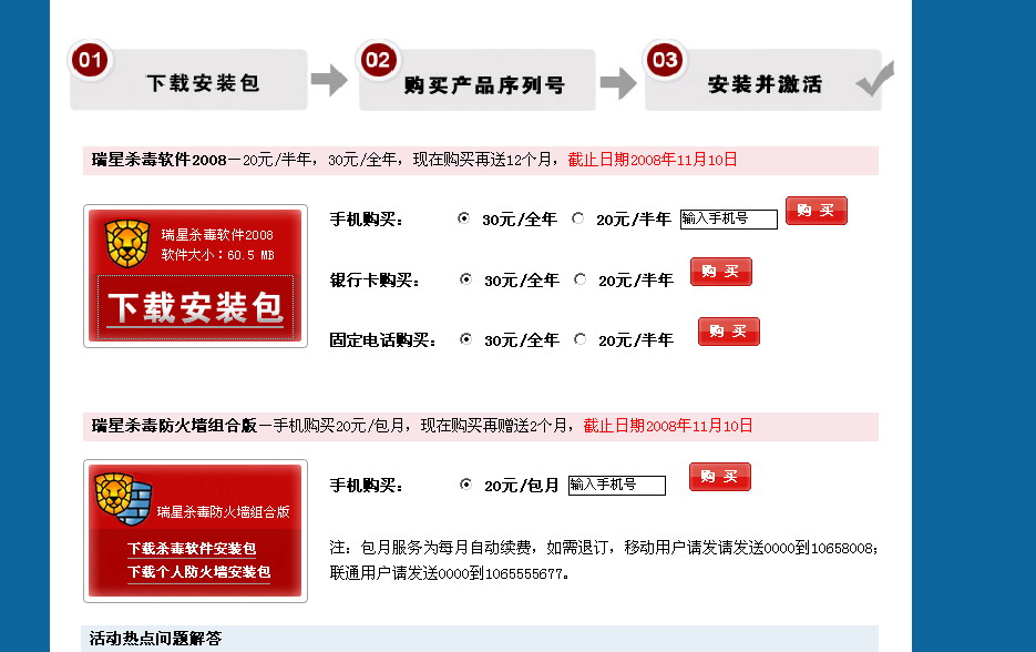 我今天购买了2008瑞星杀毒软件,也获取了序列号和用户ID,可是为什么打不开旁边的下载页面?难道我的钱要泡汤吗?