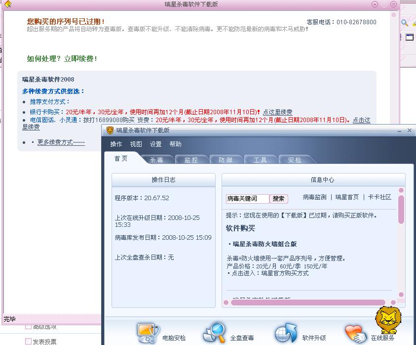 2.瑞星提示过期,下边又有几种可能出现的情况: