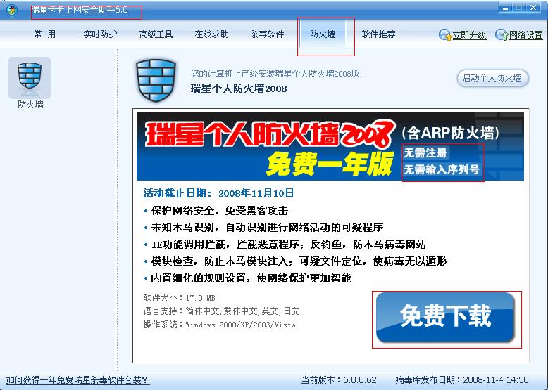 是下载的卡卡中的免费版本瑞星08版本吗?