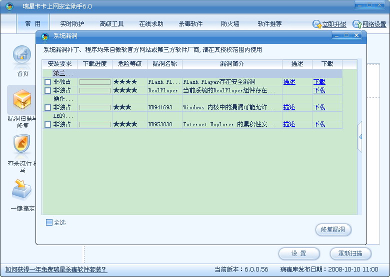 [求助] 卡卡检查出的系统漏洞,为何瑞星杀毒检查不出来?