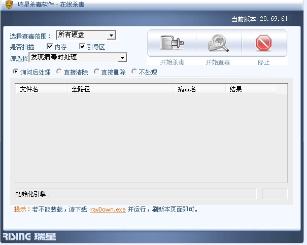 如果没有查看C:\Program Files\Rising下有没有RAVOL的文件夹,如果有删除这个文件夹(注意删除时要先关闭在线杀毒的页面),再重新登录在线杀毒!
