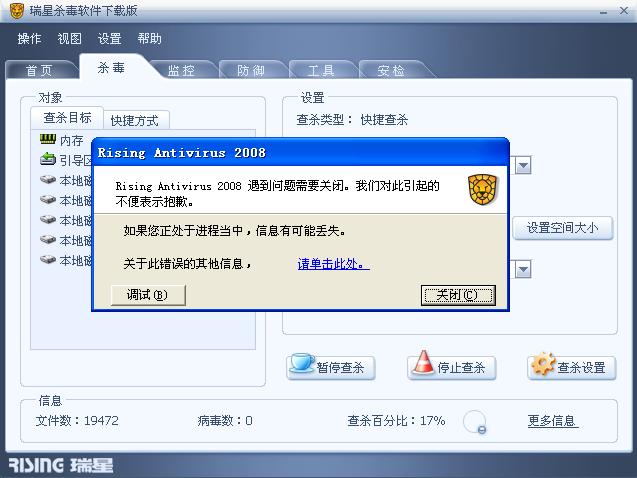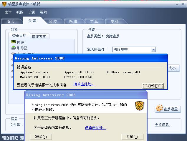 装了瑞星以后全盘扫描,在扫描中提示瑞星遇到问题需要关闭,修复了程序还是这样,也更新过,是最新程序,详细情况见截图,希望版主尽快解决。