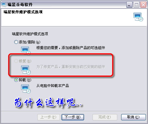 开始\程序\瑞星杀毒软件\添加删除组件\修复瑞星杀毒软件程序