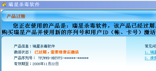 回复:为什么我的瑞星杀毒软件老是提示过期?