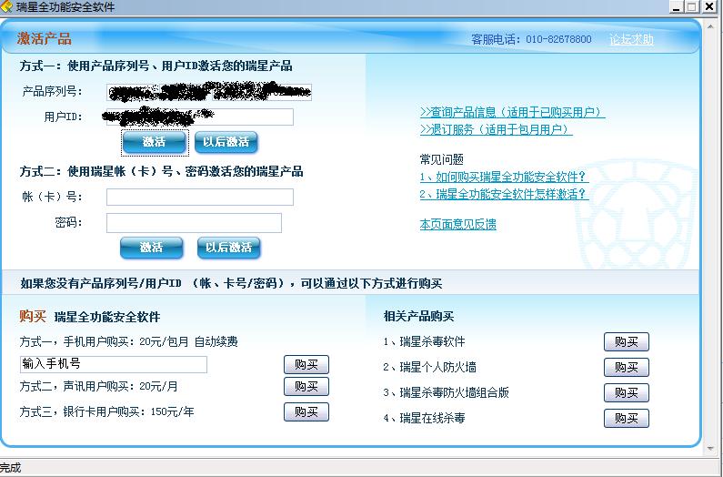 问题原因出在使用瑞星杀毒软件下载版的序列号去激活瑞星全功能软件,这是2种不同的产品,序列号和ID不能互用。