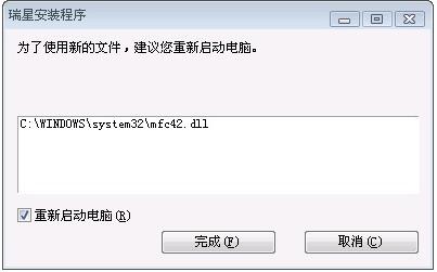 自从升级到09版以后,不论升级哪个版本,每次瑞星升级都提示我重启电脑,请问怎么回事呀?瑞星总是更新mfc42.dll文件,修复重装都没用!谢谢!当前版本号21.17.41,病毒库21.08.41.