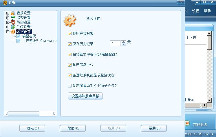 参见上图,打开瑞星-设置-详细设置-其他设置。