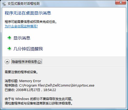 症状:升级至瑞星杀毒软件2009版后,开机出现"memory error"对话框, 电脑使用中,每隔几分钟就出现“交互式服务对话框检测”,显示消息之后出现和上面一样的对话框。目前,没发现电脑使用异常,就是频繁出现提示。麻烦帮助解决。
