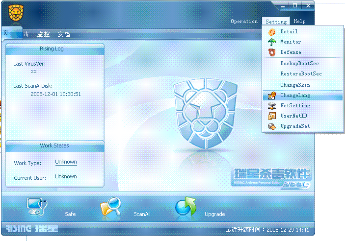 1 打开瑞星杀毒软件,界面变成英文,且设置中修改语言功能的页面,无法正常显示。