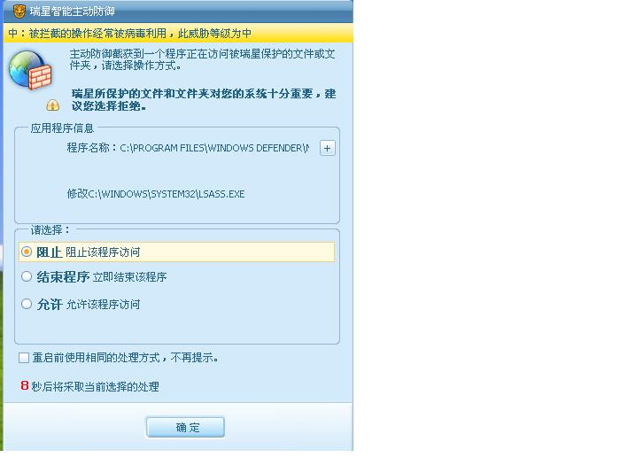 我安装了windows的defender,每次defender一运行,瑞星就进行主动防御,弹出下面的窗口