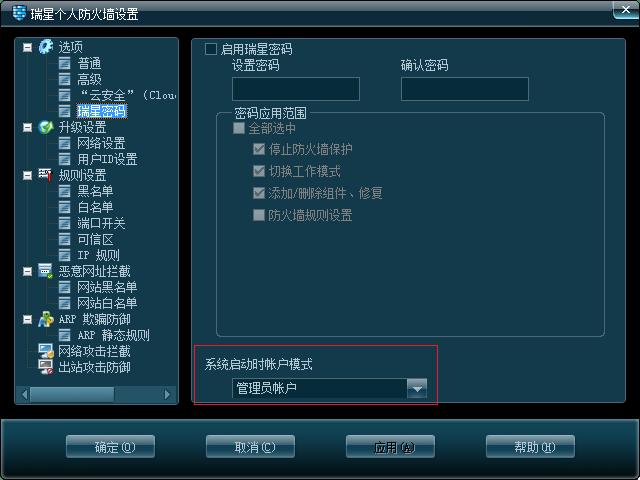 随后的几次重启中,不进行设置修改操作,仅查询或设置:其它设置——瑞星密码——启用瑞星密码打勾,系统启动时帐户模式:普通帐户