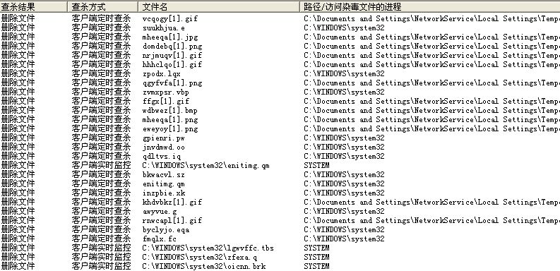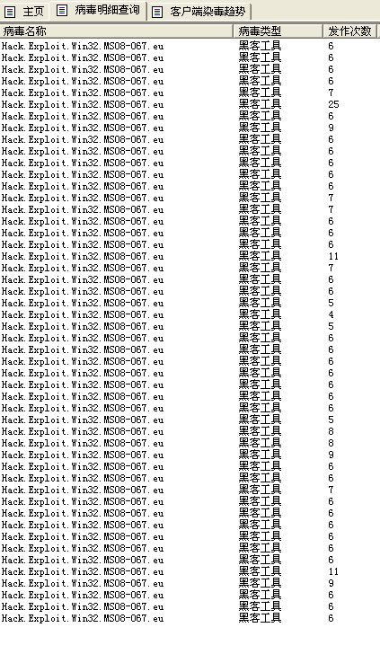 公司电脑装的是网络版的瑞星,从1月26日开始,公司的很多电脑的瑞星监控都报出 Hack.Exploit.Win32.MS08-067.eu ,但都被杀掉,系统没有什么异常的影响,网络什么的都正常,就是在system32下面生成一些文件,然后被杀掉。每天还在不断重复的出现这个毒,很闹心,各位支一下招,瑞星报出的病毒名字是这个,其他杀软报的名字不一样的。MS08-067的补丁KB958644很早就打了的。管理控制台监控的客户机的病毒记录如下。咋整呢,各位。