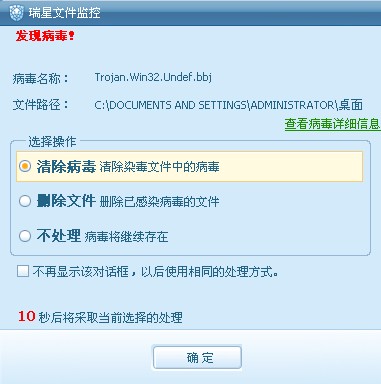 建议你全盘杀毒。我认为不是没处理,很可能是有程序在创建此病毒。详细请查看瑞星的日志,以确认