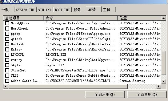 2。重启后点开始——运行 msconfig 找到启动项中命令中所有含有rising的目录项目,将前面的勾勾去除,大概有3~4项