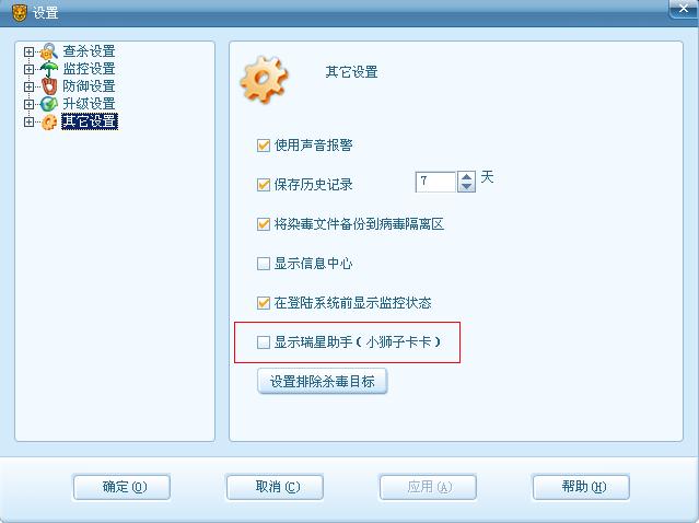 杀毒软件--设置--详细设置--其它设置--把瑞星卡卡助手前面的对勾去掉