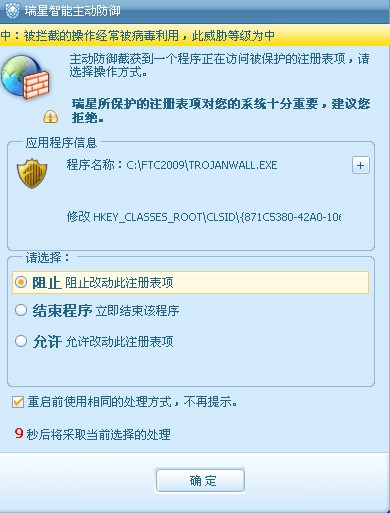 我的电脑上安装了瑞星全功能软件和风云谷科技出品的“WINDOWS木马清道夫—防火墙”软件,每次开机或重启动后,瑞星都会弹出如下图的窗口,提示木马清道夫在修改注册表并进行拦截,我的瑞星设置里已经把这个软件列入白名单了的,可照样每次都拦。在风云谷的论坛里也有其他网友提出遇到同样的问题,对方解释说他们的软件并没有进行这个注册表项的修改。请问这是怎么回事?