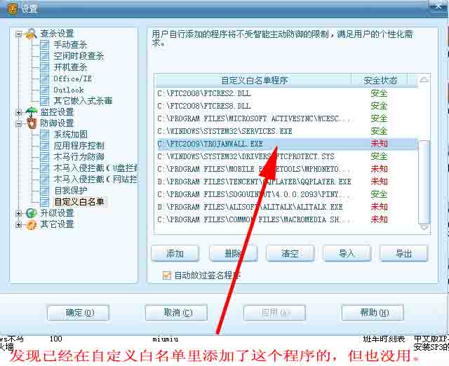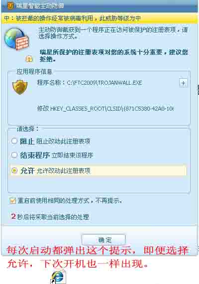 虽然在 防御设置 \ 自定义白名单 \ 添加了c:\ftc2009\trojanwall.exe, 但每次开机后,瑞星智能主动防御 均提示-->“阻止” 或 “结束程序” 或 “允许”,即便每次都选择 “允许”,但下次开机照旧。