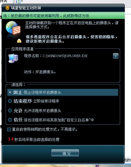 在我的电脑里面打开摄想头被拦截,是怎么回事?我20号用的时候还没有。结束进程后正常了,可重起电脑后又是这样。请问这个是病毒吗? 如图: