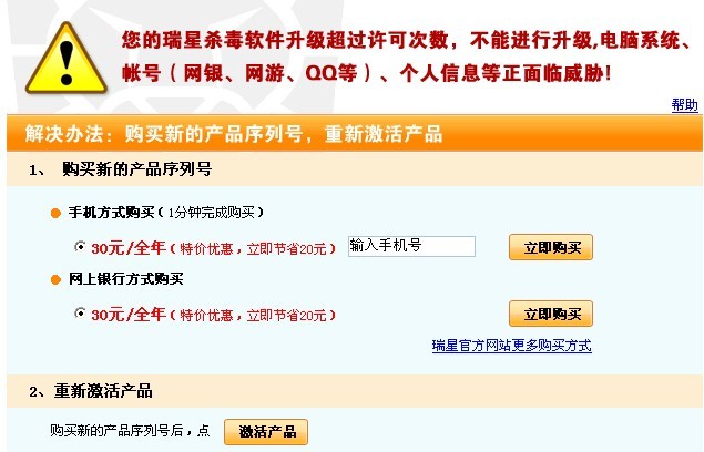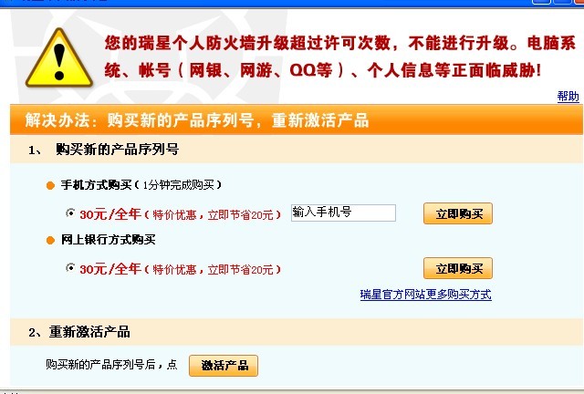 楼主购买的瑞星属于单机版产品,只能在一台电脑的一个操作系统中使用,安装多台电脑会出现这种情况。如果楼主没有安装多台电脑,请您将联系电话和姓名通过论坛短消息发送给risingcsc,工程师会尽快与您联系。