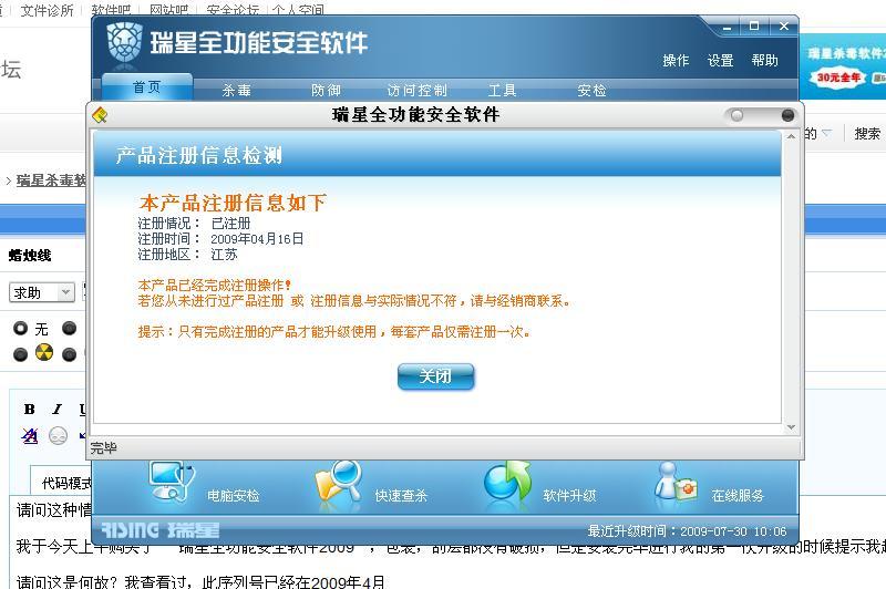我于今天上午购买了 “瑞星全功能安全软件2009”,包装,刮层都没有破损,但是安装完毕进行我的第一次升级的时候提示我超过升级次数