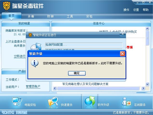 这两个是不同的概念。瑞星更新病毒库和更新软件版本的时间是不同的。可能在这两个时间差内显示的情况就是 “只更新了软件版本而没有更新病毒库”。病毒库更新时间大概在下午16点左右