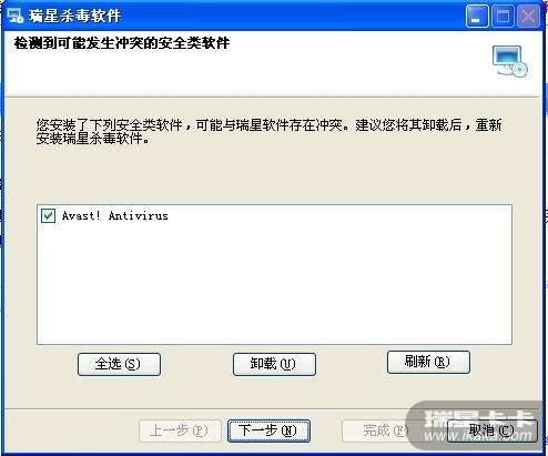 我在更新瑞星版本并要进行安装时 发现瑞星跟我系统中的另一款杀毒软件 avast! 有冲突 必须卸载avast! 才能进行瑞星的更新安装 但我并不想卸载 avast! 请问如何解决?