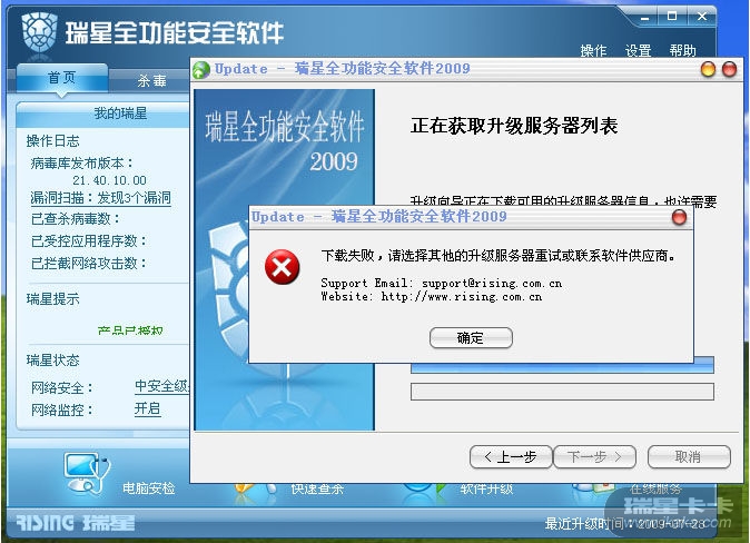 我是才买的2009全功能软件,用了大概一星期左右,今天我对它升级,系统提示说:下载失败,请选择其他升级服务器或联系软件商。 然后我对他进行修复,修复到最后一步的时候系统说:操作被用户中止。 请问这是怎么回事啊?我该怎么办? 麻烦各位高手指点指点,谢谢,谢谢,谢谢,谢谢!!