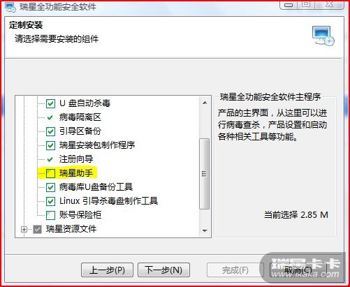 如果你还想把它彻底删掉不用了,可以点:开始--瑞星--添加删除组件--下一步--把瑞星助手前的勾去掉(如图)---下一步----完成。