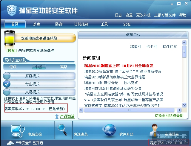 回复:瑞星杀毒软件和全功能安全软件在登录前查杀窗口显示的版本号是程序版本号而不是病毒库版本号