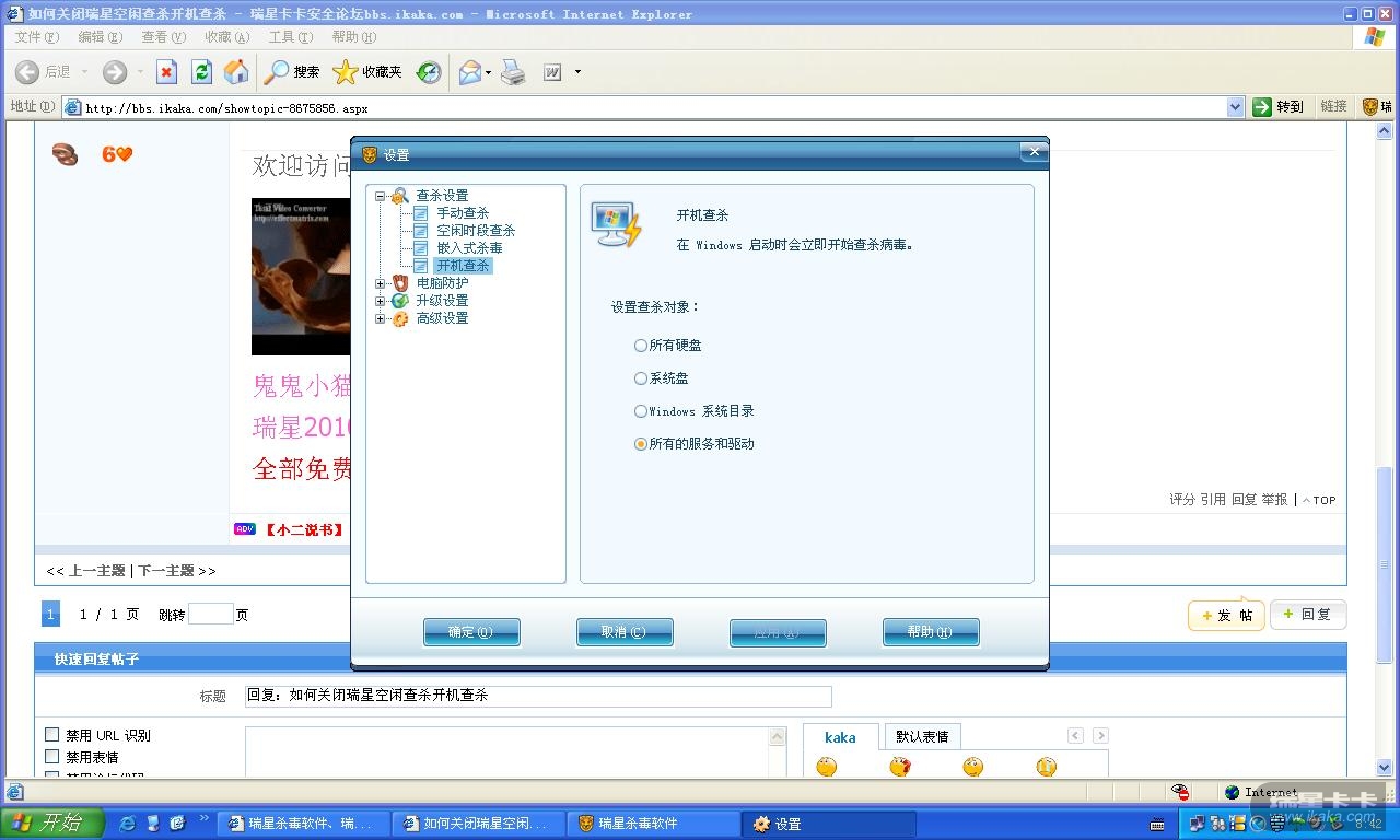 回复:如何关闭瑞星空闲查杀开机查杀