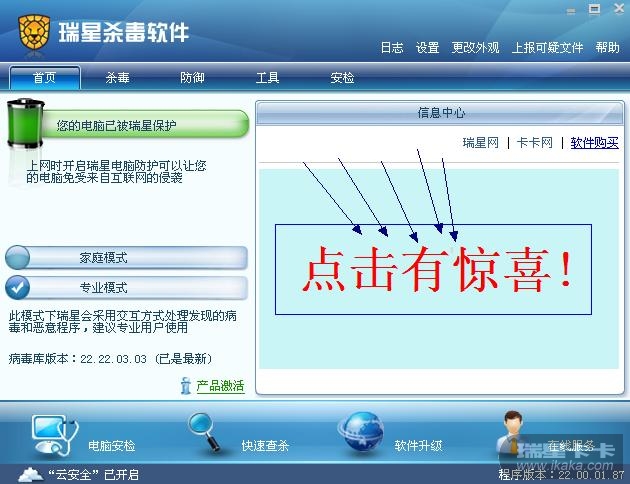 今天打开瑞星杀毒软件,在以前信息中的位置变成了几个红色大字"点击有惊喜",感觉的有点奇怪,不敢贸然点击。。