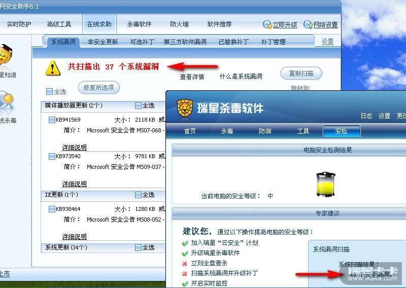 【解答】瑞星杀毒软件安检扫描结果和卡卡漏洞扫描结果如下图所例:
