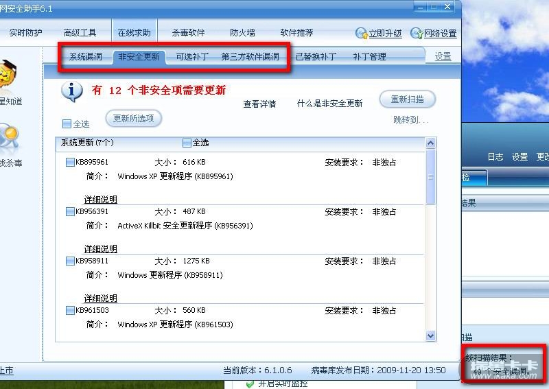 现在卡卡升级了,漏洞扫描里把补丁分成了不同的类型。。。 楼主按不同类型的补丁找找看。
