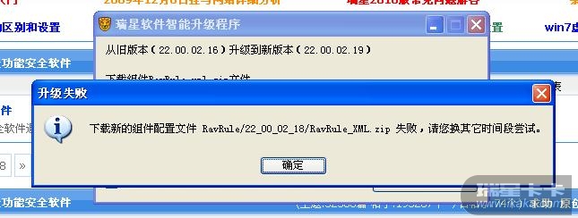 将系统里的杀毒软件完全卸载,卸载时不保留配置文件,手动将瑞星安装目录下的文件删除,将C:\Documents and Settings\All Users\Application Data\Rising\Ris(或rav)下的文件手动删除,网站下载新的安装程序,重新安装再升级。