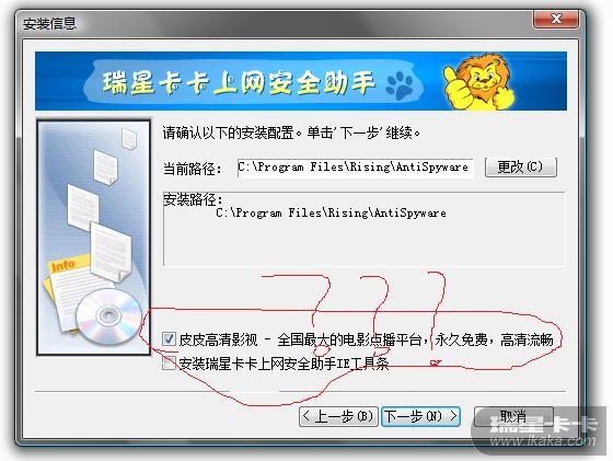 好,我就麻烦一点手动一下。再次安装卡卡,发现6.1.0.31版的卡卡多了一个“皮皮高清影视”的默认勾选的按钮,请问:卡卡是清除流氓软件的软件还是本身就是流氓软件???