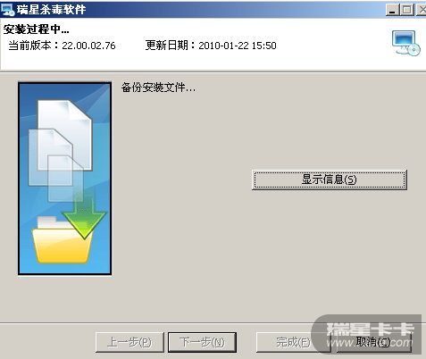 我从官网下载瑞星2010,在安装到备份安装文件页面时,页面就不动了,等了很长时间都不行,我试了好几次都是这种情况,我的系统是XP